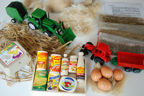 Overige materialen: klompjes; zuivelpakket; doosje eieren; dienblad met etenswaren; tractoren met karren; etuis met koeienvoer en stro; plastic boerderijdieren, poppetjes en hooibalen