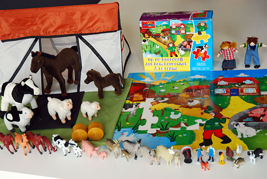 Spelmateriaal: boerderijpuzzel; uitvouwbare boerderij met 6 dieren