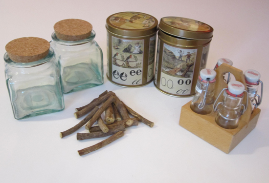 Keukenmaterialen: 2 stoppotten en 2 aap-noot-miesblikken (1 met zoethout)