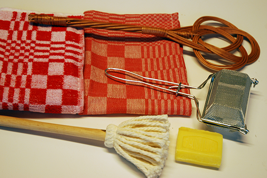 Schoonmaakmaterialen: een stuk zeep; zeepklopper; houten afwasborstel en een mattenklopper, keukendoek en theedoek
