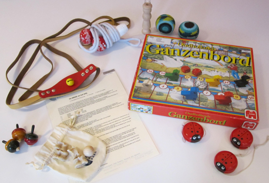 Spellen: springtouw; bikkelspel met handleiding; paardentuigje; drie tollen; drie jojo’s; ouderwets ganzenbord; punnikklosje en speldenkussentjes
