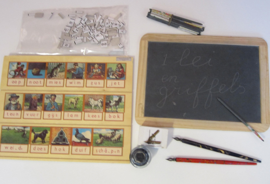 Schoolmaterialen: leesplankje met lettertjes; lei en griffels; twee kroontjespennen; doosje met kroontjes en een inktpot