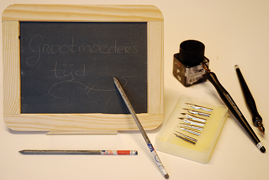 Schoolmaterialen: lei en griffels; twee kroontjespennen; doosje met kroontjes en een inktpot