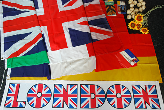 Overige materialen: landkaart Groot-Brittannië, kaart van Londen, vlag Duitsland, vlag Frankrijk, vlag Groot-Brittannië, vlag Italië, streng knoflook, 4 zonnebloemen, Eiffeltoren van karton; banner London